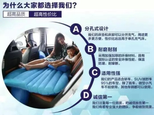 和传统的车载充气床相比我们不光多了一个靠背,而且,三部分还是分开的可在车上,水里,陆地三用。为什么又多了一个靠背喃?因为轿车本身的长度,决定成人不能完全躺下,只有作为躺椅更科学,更实用。