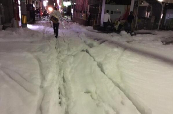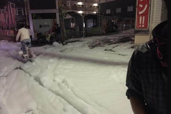 周五深夜到周六凌晨这段时间,有民众发现福冈市中心出现大量白色泡沫,纷纷拍照上传网络,有网友猜测:是谁家的浴盐漏出来了?还打趣说:可以洗泡泡澡了。